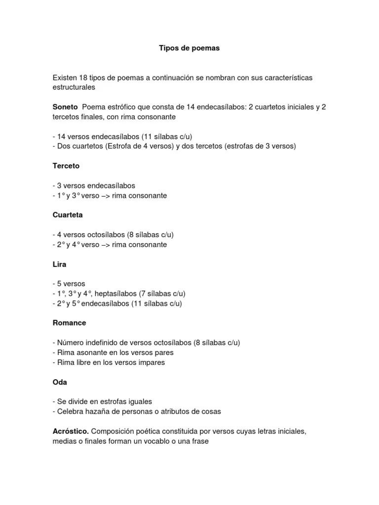 Un poema (del latín poema, y este del griego ποίημα, «creación») 1 es una obra de poesía normalmente en verso, 2 esté o no sujeto a los recursos poéticos clásicos de la métrica, el ritmo y la rima. Tipos De Poemas Pdf